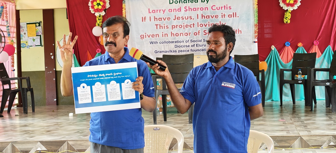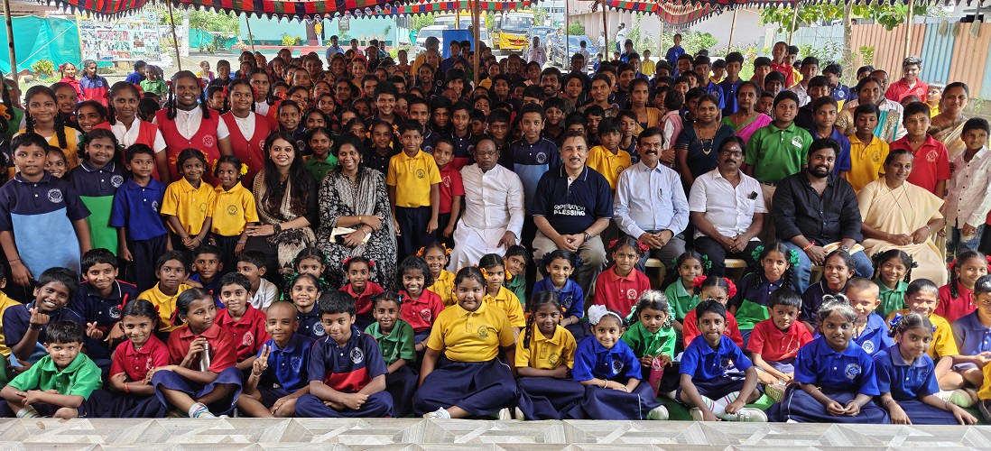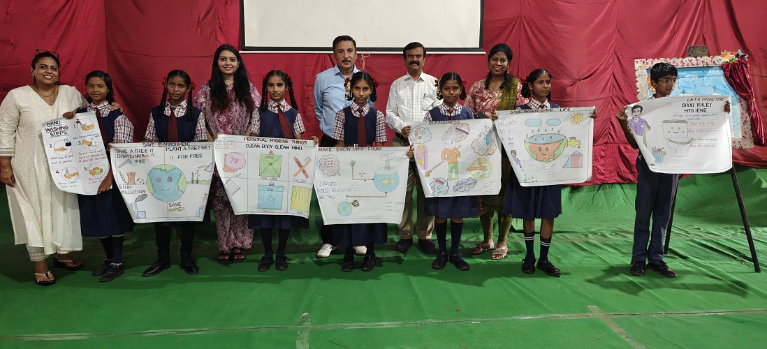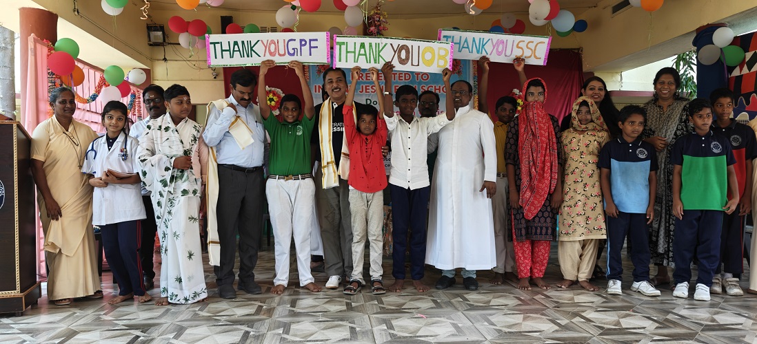 Children of Infant Jesus English Medium High School Bhuvanapalli displaying sign boards of GPF, OB and SSC in gratitude of School WASH project inaguration on 17.09.25