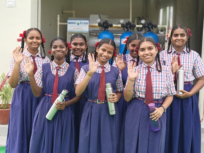 VEDA School girls at RO Plant with a sigh of relief for drinking water